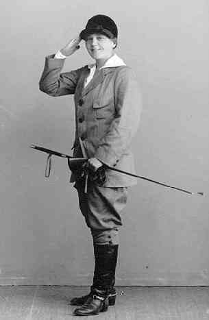 Porträtt i helfigur av Barbro Weman som gör honnör. Hon är klädd för att rida.