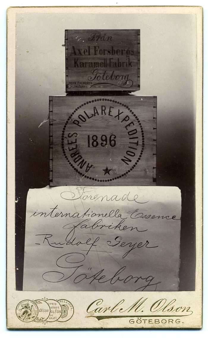En större och mindre trälåda stående på varandra. De är märkta "Andrées Polarexpedition 1896" respektive "Från Axel Forsbergs Karamell-Fabrik Göteborg". Under dessa hänger det ett pappersark med texten: "Förenade internationlle essence fabriken Rudolf Geyer Göteborg".