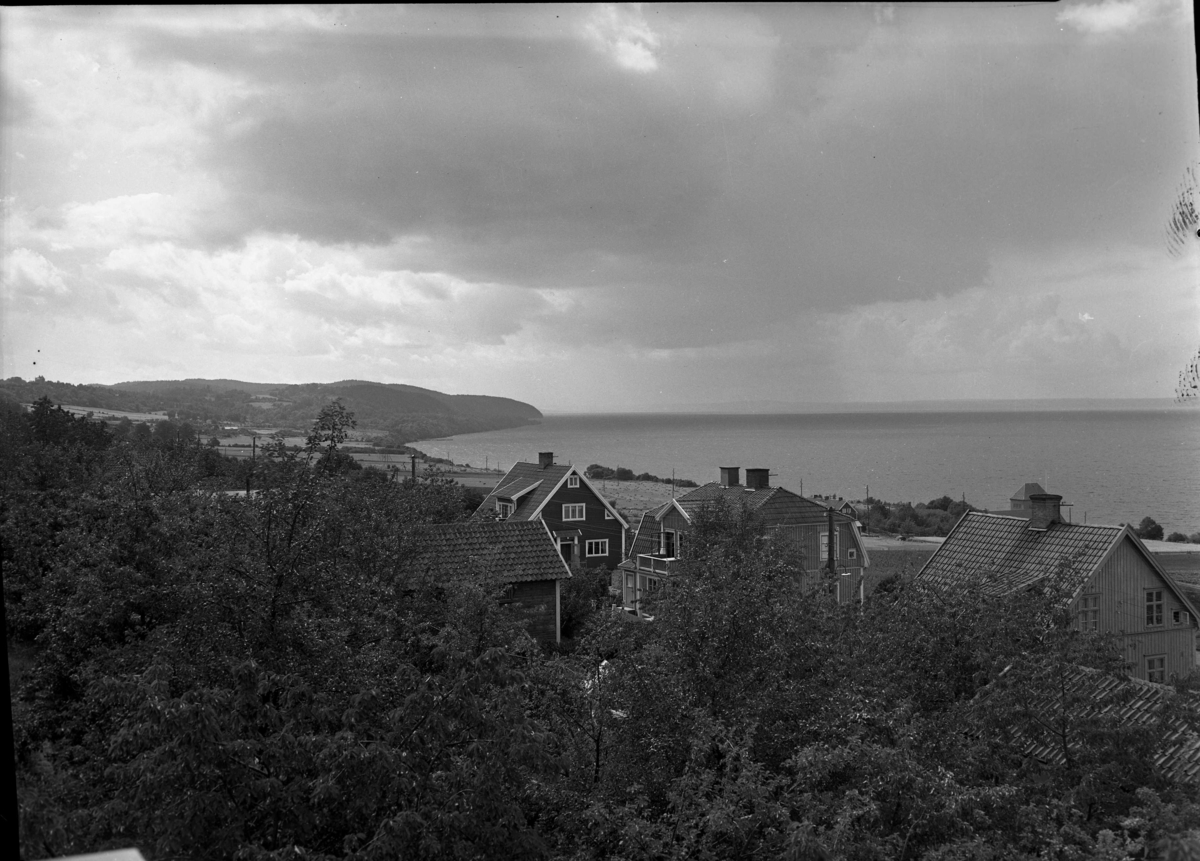 Sannolikt utsikt från en villa utmed Jönköpingsvägen i Gränna. Trädgårdar och villor hitom Vättern.