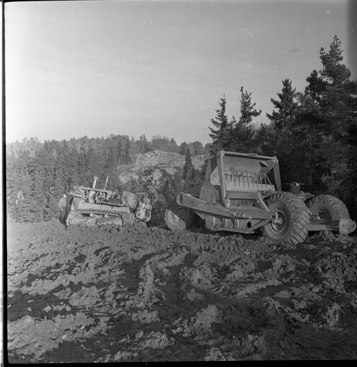 Vägmaskiner i arbete, i samband med motorvägsbygget vid Gränna/Röttle, etapp II.