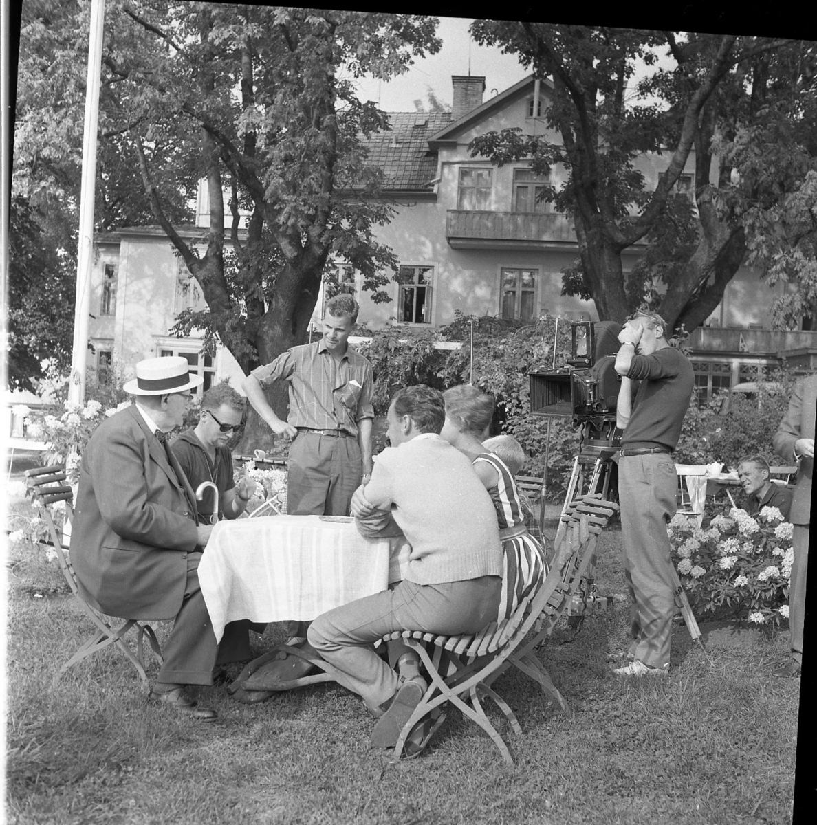 En man, en kvinna och två pojkar sitter vid ett trädgårdsbord i en trädgård. Framför dem sitter två herrar. Ståendes runt bordet befinner sig fyra personer. En filmar de sittandes.