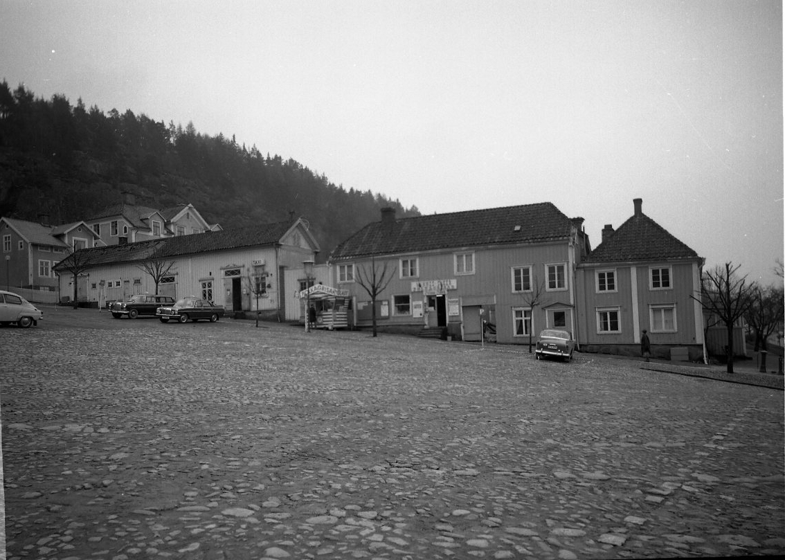 Bebyggelse utmed södra sidan av torget i Gränna. Enstaka parkerade bilar.