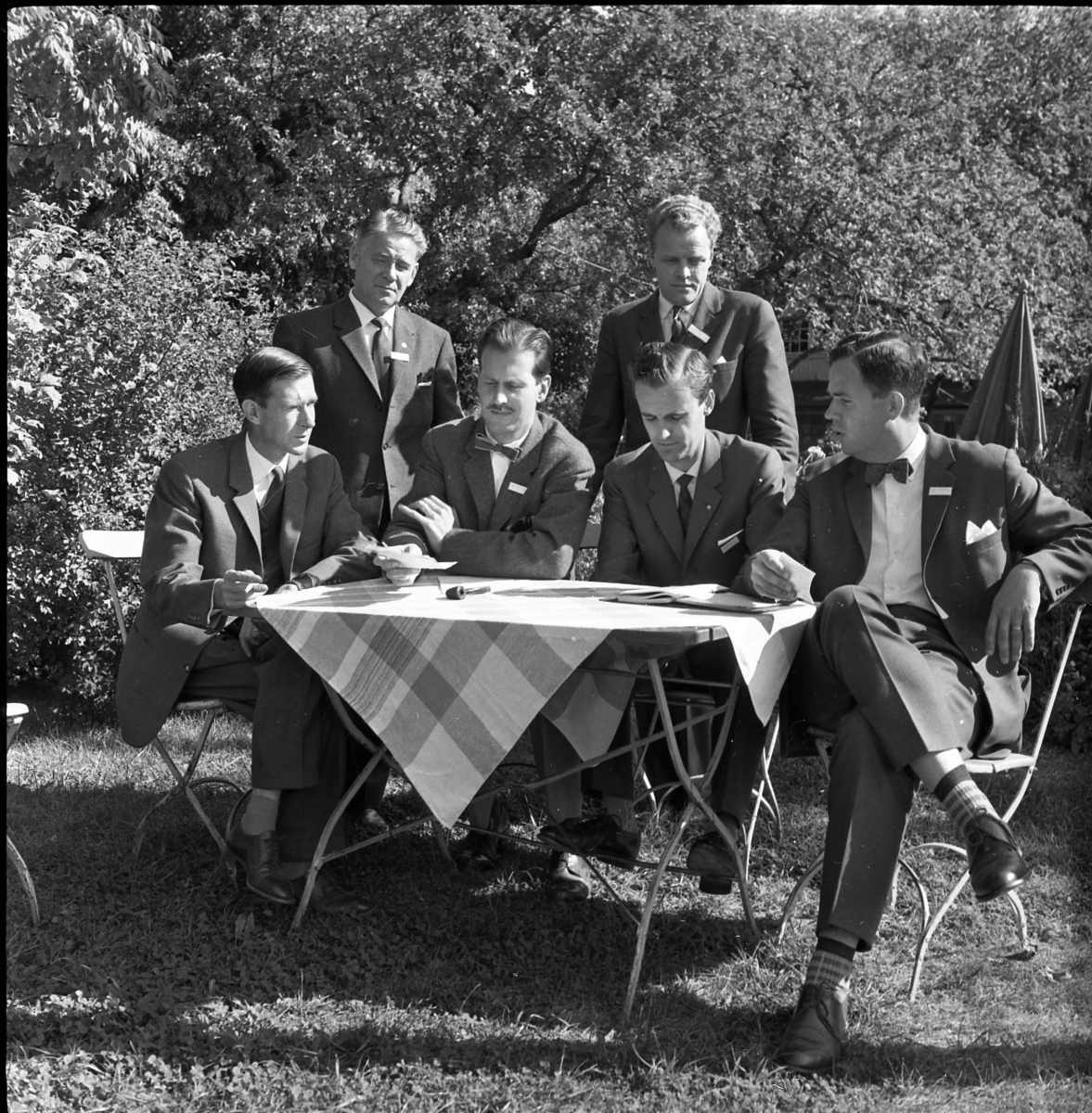Fyra män sitter i en utemöbel i en lummig grönyta. Två män står bakom dem. På bordet ligger en pipa.