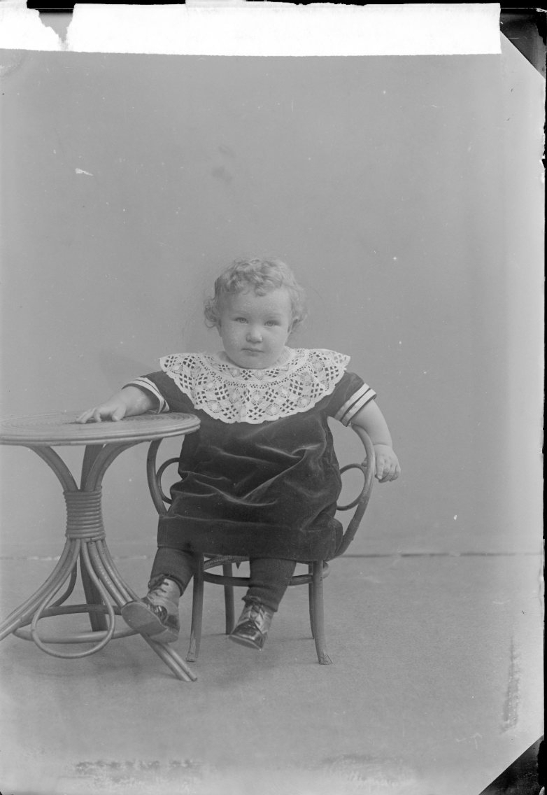 Porträtt av en liten lockhårig pojke som sitter i en barnmöbel.