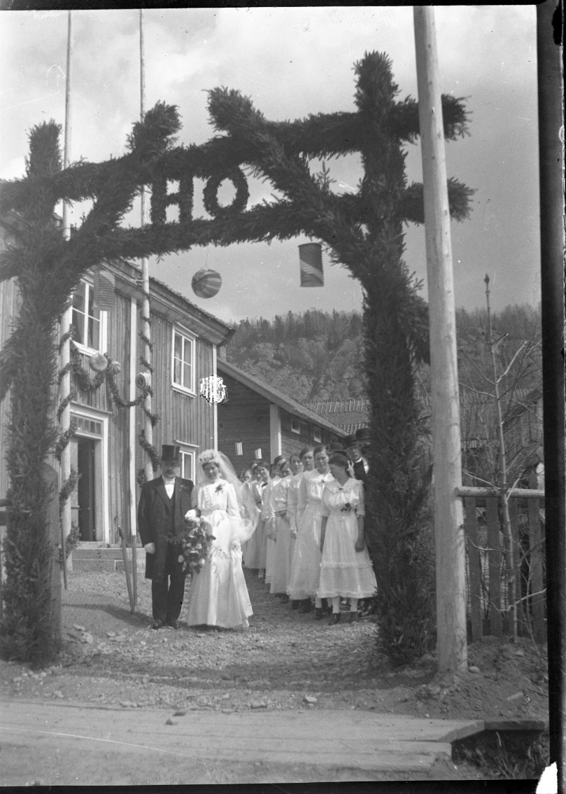 Ett brudpar med följe står på en gårdsplan, hitom dem en lövad portal krönt med initialerna "H O".
