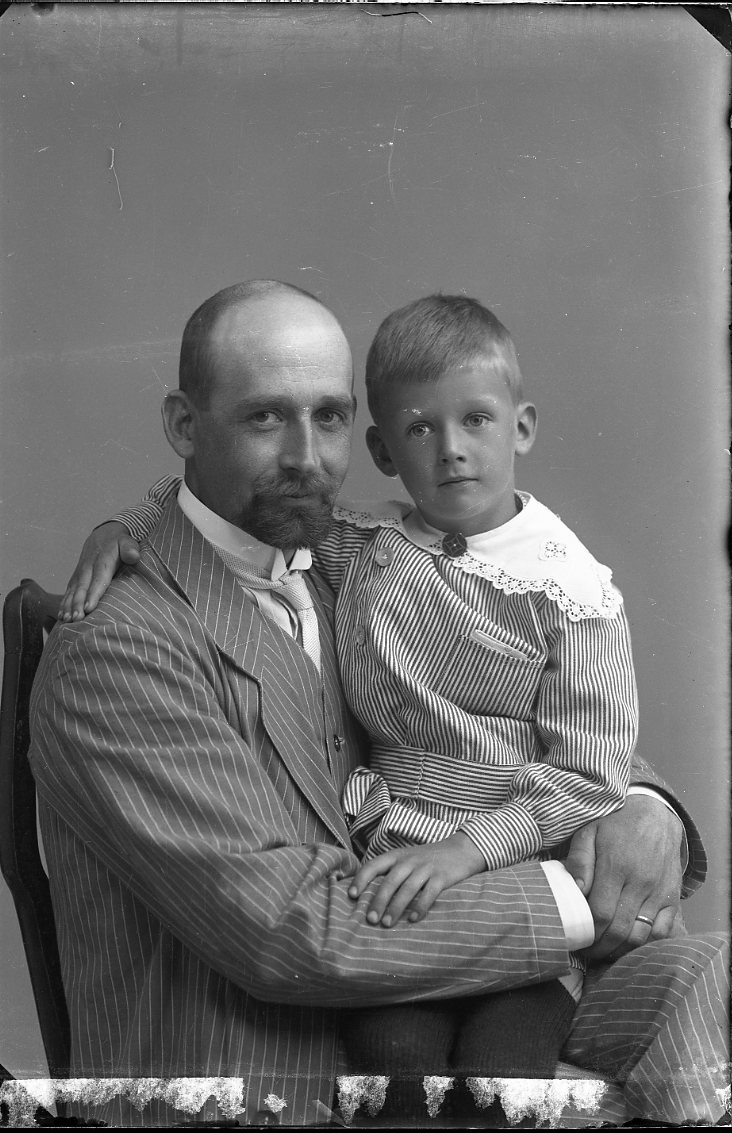 En man i kritstrecksrandig kostym sitter med en pojke i sitt knä. Pojken är möjligen Alf Svensson, och mannen hans pappa.