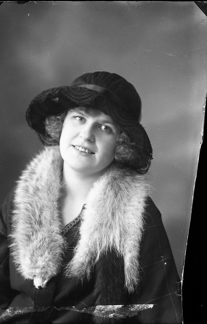Porträtt av en ung kvinna med hatt boa runt halsen.