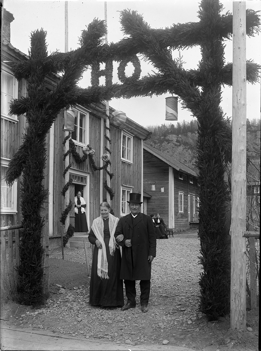 Ett äldre par, kvinnan med virkad sjal och mannen med hög hatt, står under lövad portal med initialerna "H O". En omålad tvåningsbyggnad med locklistpanel på gården, en kvinna står på trappan. Är paret föräldrar till ett brudpar eller är de brudparet.