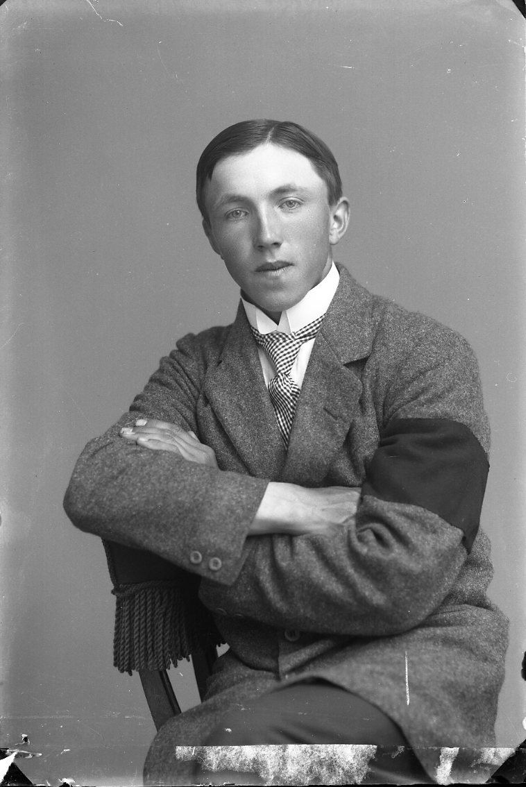 Porträtt av en ung man i finkostym som sitter på en stol med armarna i kors. Han har ett mörkt band runt vänster överarm.