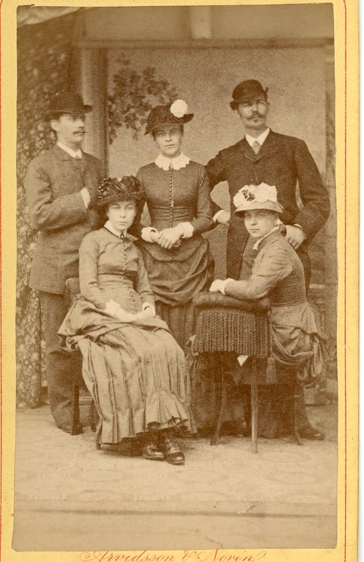 Kabinettsfotografi av en grupp med två unga män och tre unga kvinnor.
