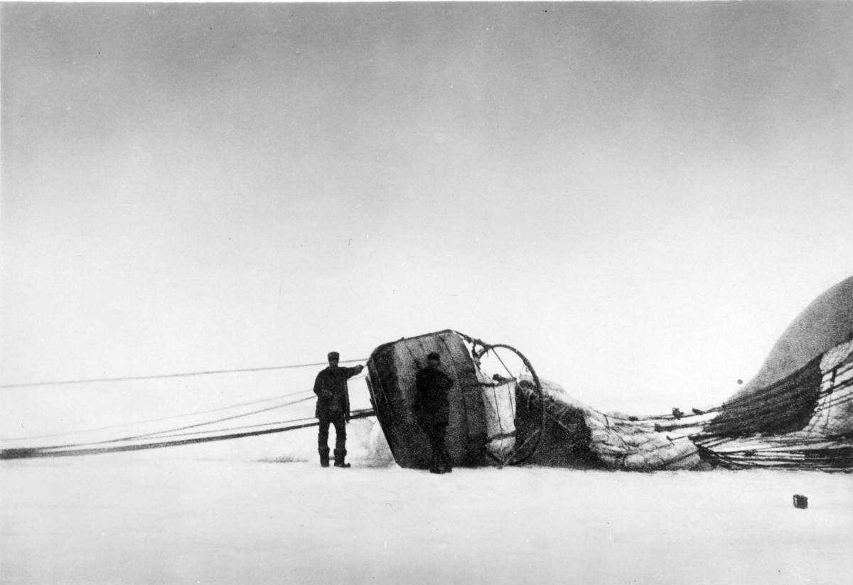 Örnen har landat. N Strindberg till vänster och S A Andrée till höger. Retuscherad version av gm.II-28.