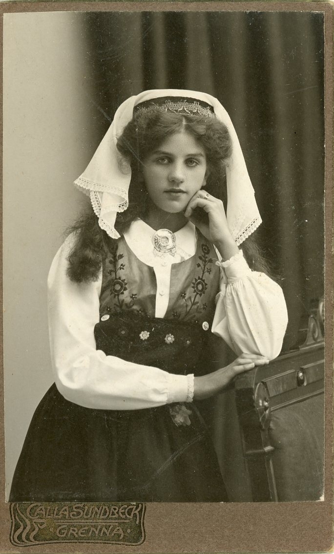 Kabinettsfotografi av en flicka i tonåren. Hon bär en folkdräkt.