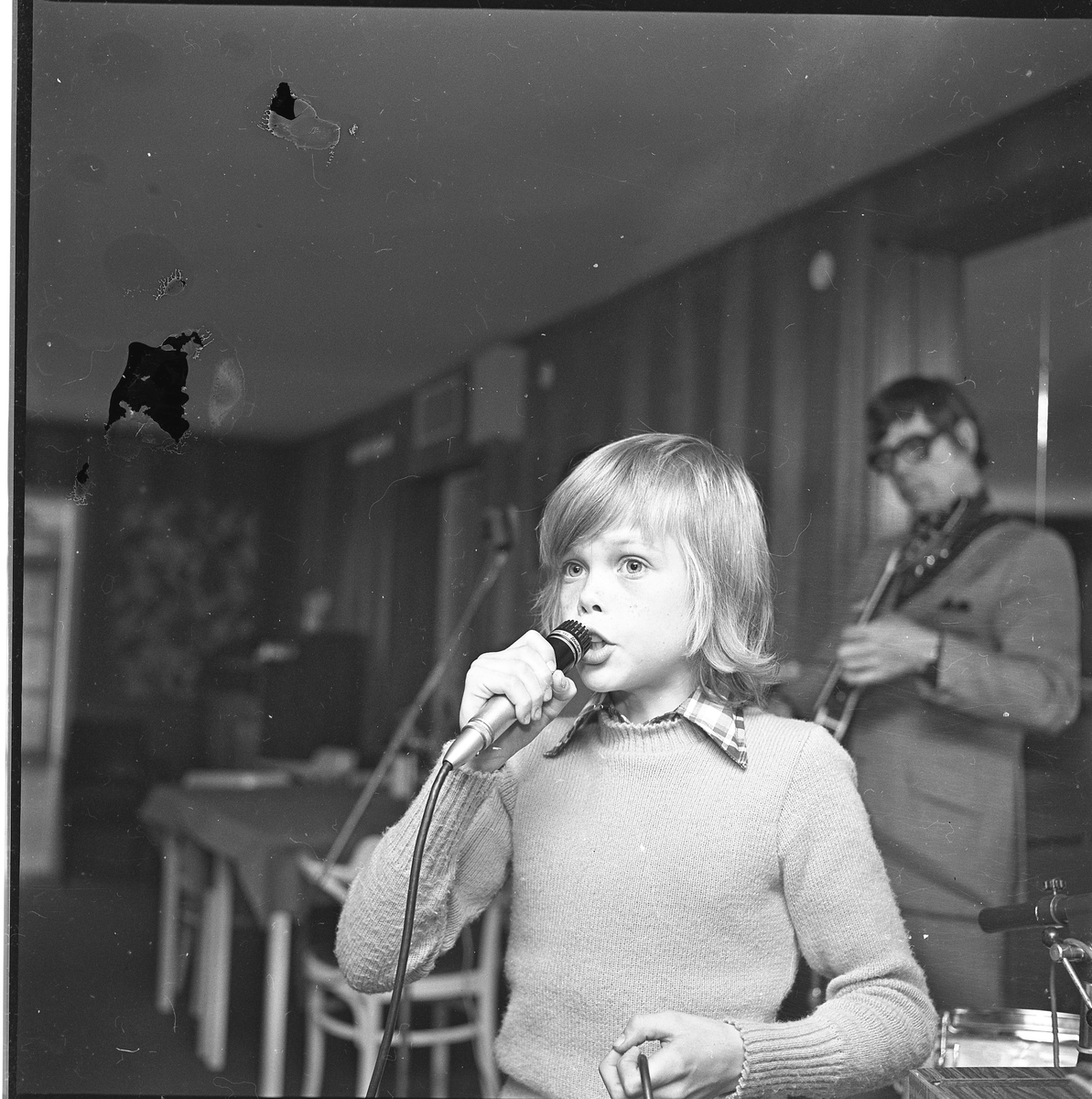 En liten pojke med mikrofon som sjunger. Bakom honom en gitarrist.