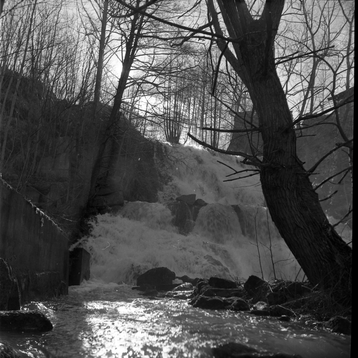 Vinterlandskap. Bilden föreställer ett vattenfall längst med Röttleån i Röttle by.