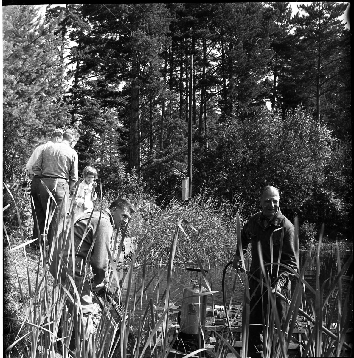 Rotenonbehandling i Bergadammen 1961. En man står i en båt intill en strand. Han håller i ett långt mustycke som leder till en metallbehållande. På land står två män i vita skjortor och ett litet barn.