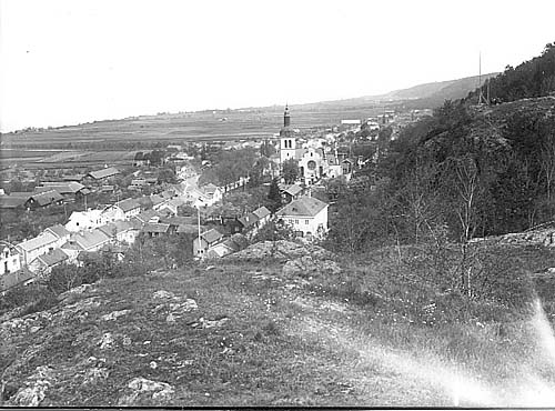 Vy norrut över Gränna från Grännaberget med kyrkan i centrum.