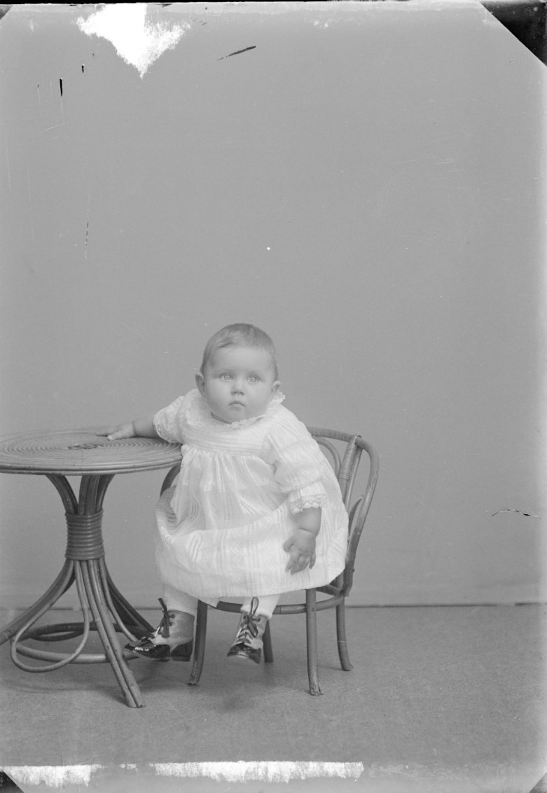 Porträtt av ett spädbarn som sitter i en barnmöbel.