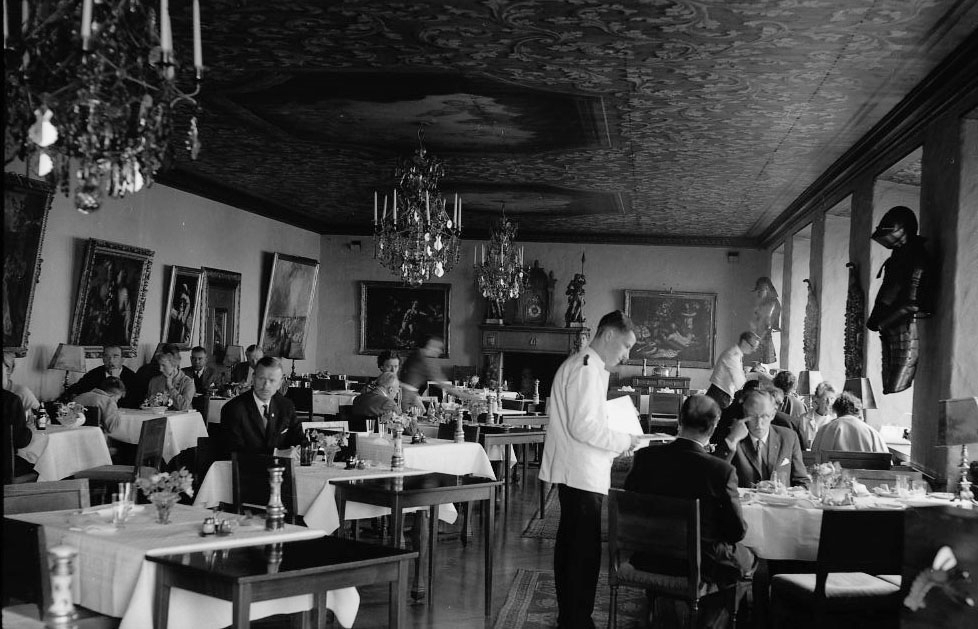 Matsalen till hotell/restaurang Gyllene Uttern med gäster. En servitör tar upp beställning.