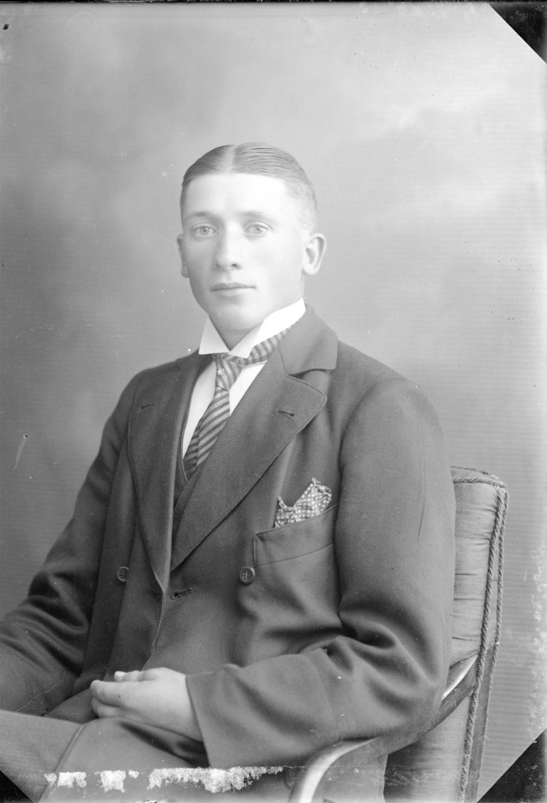 Porträtt av en pojke i övre tonåren, i kostym och slips.