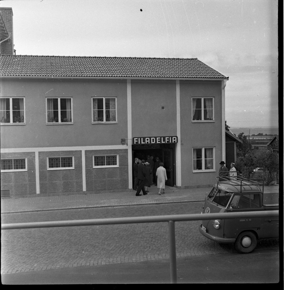 Besökare på väg in till Filadelfiakyrkan. En VW-pickup från "Firma Byggmaterial" står parkerad på Brahegatan.