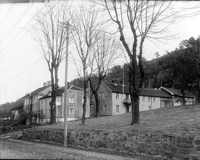 Kvarteret Brahe från sydväst. I södra änden av huset mot Brahegatan sitter en skylt: "Polkagrisfabriken".