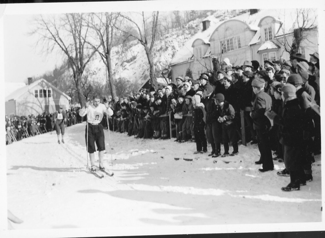 Skidåkare på Gränna torgs övre del (östra) nedanför Borgmästargården. Mycket publik. Det är troligen Braheloppet.