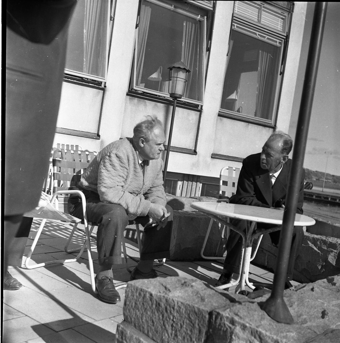 Två män sitter i trädgårdsmöbler på en uteplats vid en hamn. Det är soligt väder.