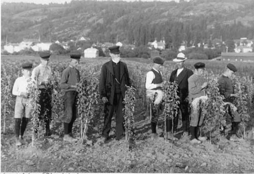 Två äldre män och sex pojkar står bland plantor på en åker mellan Gränna och Vättern.