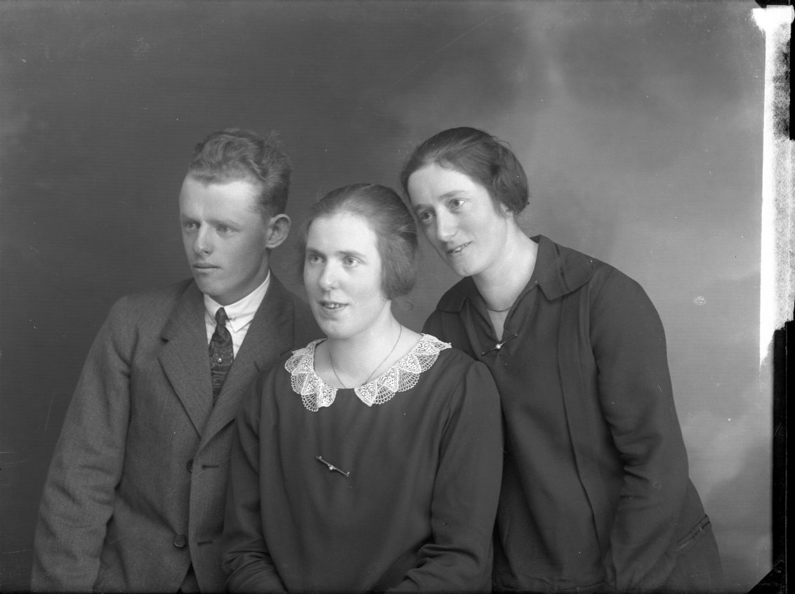 Gruppbild med en man och två kvinnor. En av kvinnorna är Ingrid Andersson i Ölmstad. Möjligen en syskongrupp, barn till prästgårdsarrendatorn Karl Andersson och hustrun Hanna Larsdotter i Ölmstad?