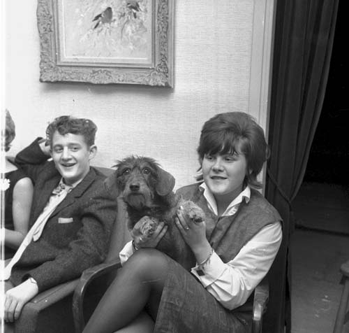 En kvinna sitter i en fotölj med en hund i famnen. Bredvid henne i en soffa sitter en ung man. Kvinnan har kort tuperat hår. Bakom dem hänger en tavla med bofinkar på.