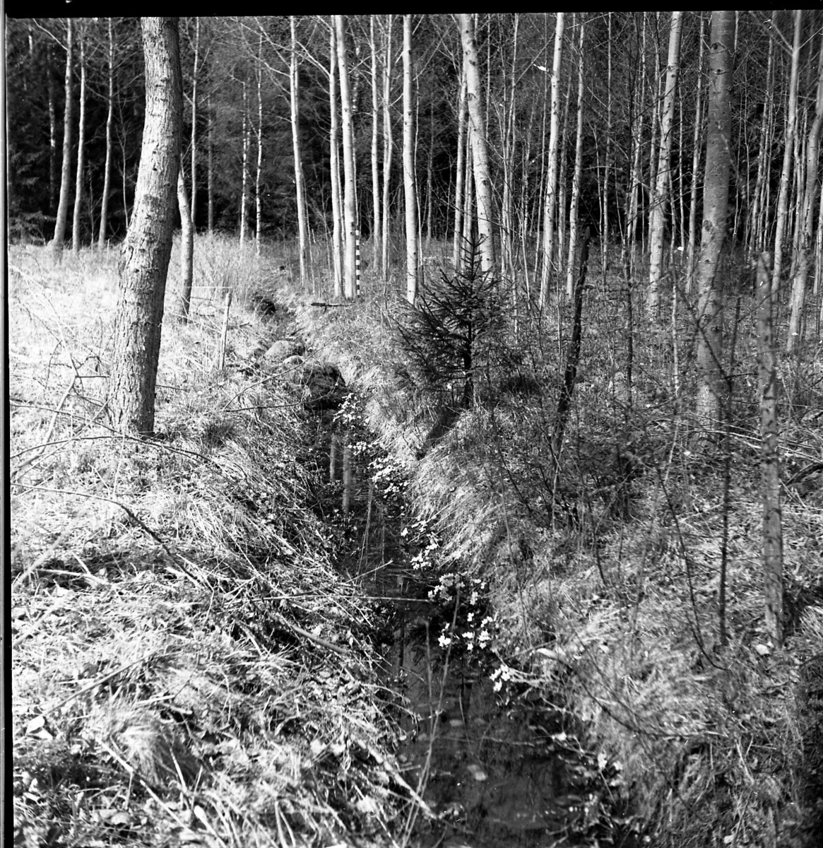 Bilden föreställer ett landskap med ett vattenfyllt dike, det växter blommor längst med dikeskanten, eventuellt kabbeleka. På vardera sida om diket står lövträd och längre bort står barrskog.