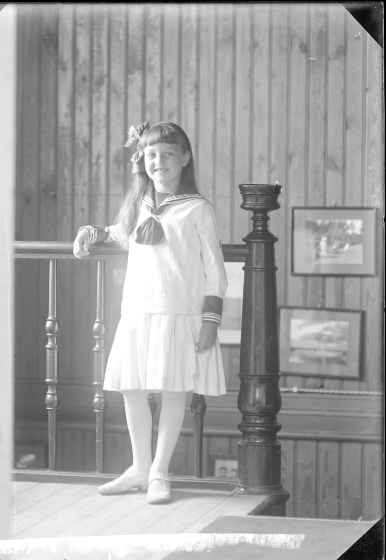 En flicka i sjömansklänning och rosett i håret står lutad mot ett trappräcke.
