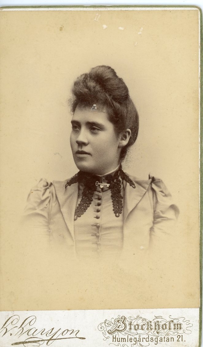 Kabinettsfotografi: en okänd ung kvinna med håret uppsatt i en knut. Brosch i form av en nyckel? vid halsen.