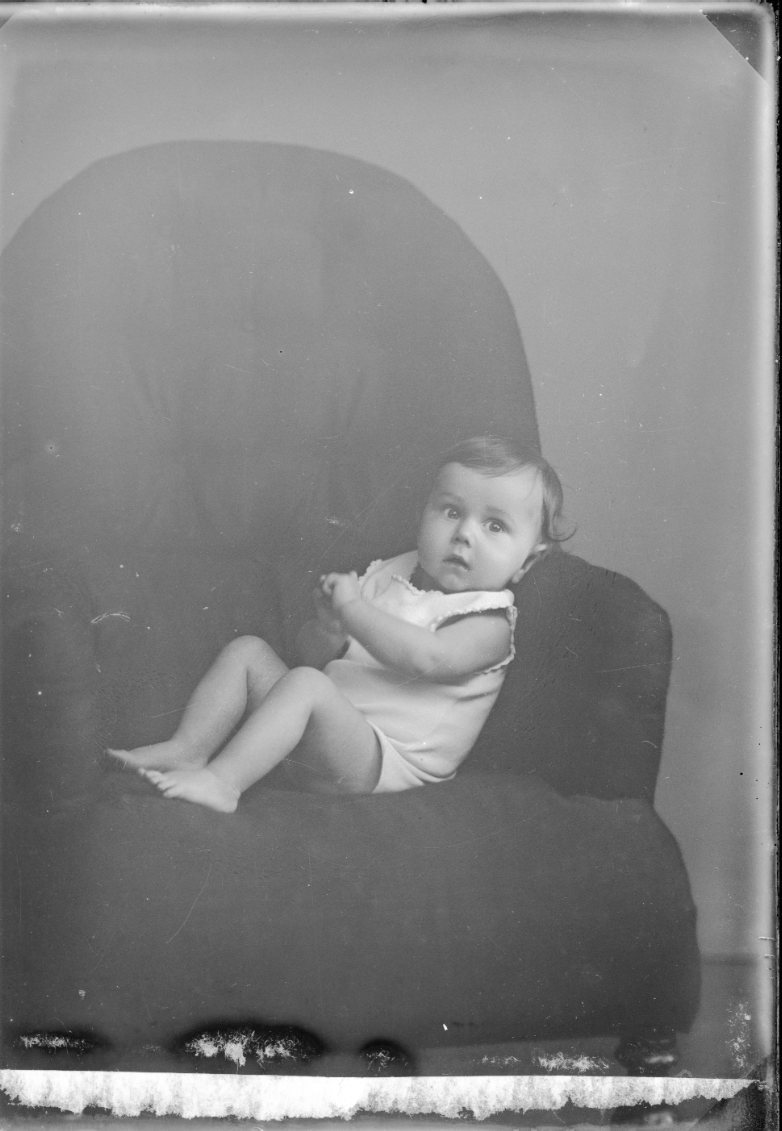 Porträtt av ett spädbarn som sitter i en fåtölj.