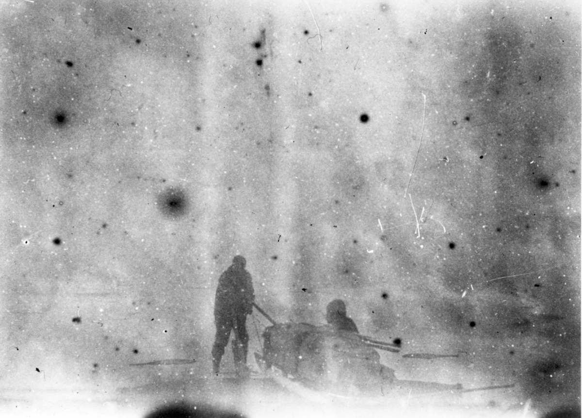 Oretuscherad. Isvandringen. En släde transporteras över öppet vatten på en båt. Troligen Knut Fraenkel på isen och S A Andrée i båten. Reprofotografi av gm.III-80.