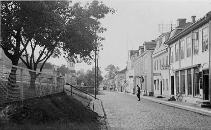 Brahegatan söderut från torgets norra uppfart. Närmast i bild till höger ligger "Matsalar Kafé" följt "Damfrisering" och "Holgers Pappershandel". Enstaka cyklar står parkerade utmed gatan. En man går över gatan. Trottoaren har en rad med borgmästarsten.
