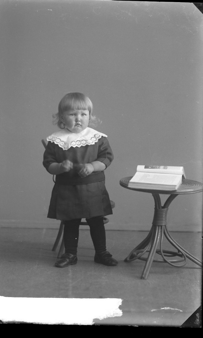 Porträtt av en liten pojke som står vid barnmöbler; en stol och ett bord med en bok.