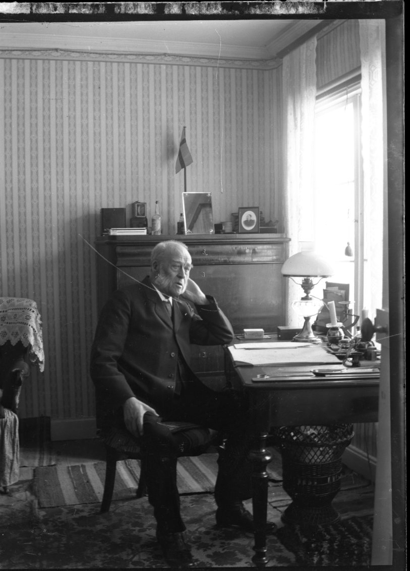 En äldre man sitter vid ett skrivbord framför ett fönster. Han är vänd mot fotografen och vilar huvudet i vänster hand.