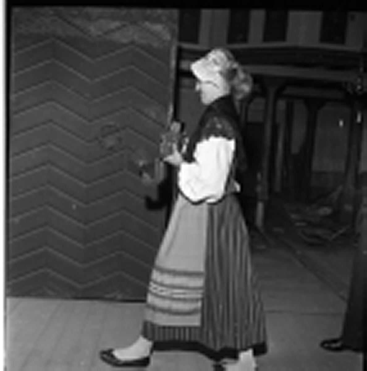 En kvinna befinner sig i rörelse, hon är på väg någonstans. Hon håller en kamera på magen och är klädd i en traditionell randig bomullsklänning med en spetskrage och hätta på huvudet. Eventuellt befinner hon sig i Gränna kyrka med tanke på att årtalet 1895, året då kyrkan återinvidges efter branden, syns på väggen i bakgrunden. Det ligger plankor på golvet.