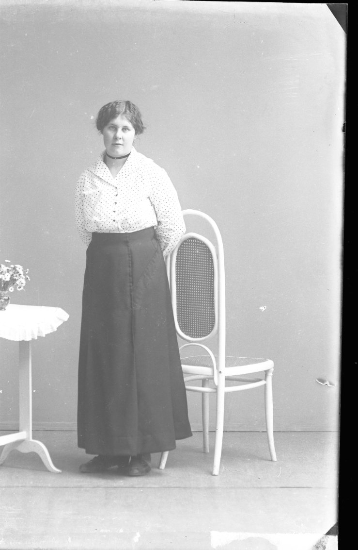 En ung kvinna i prickig blus och mörk klänning står vid bord och stol.