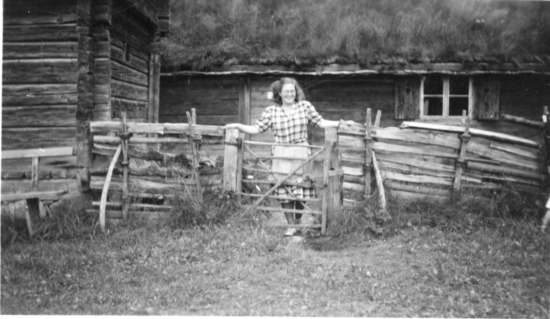 En kvinna med glasögon, rutig klänning och förkläde står vid grinden Pappersmakarebostället på Grännaberget.