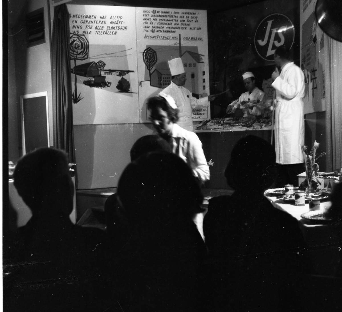 Tre män står vid ett bord på en scen. De bär vita rockar och två av dem bär kockmössor. På bordet ligger ett stort köttstycke. Nedanför scenen står en kvinna vid ett bord. På det bordet står det flera serveringsfat med mat.