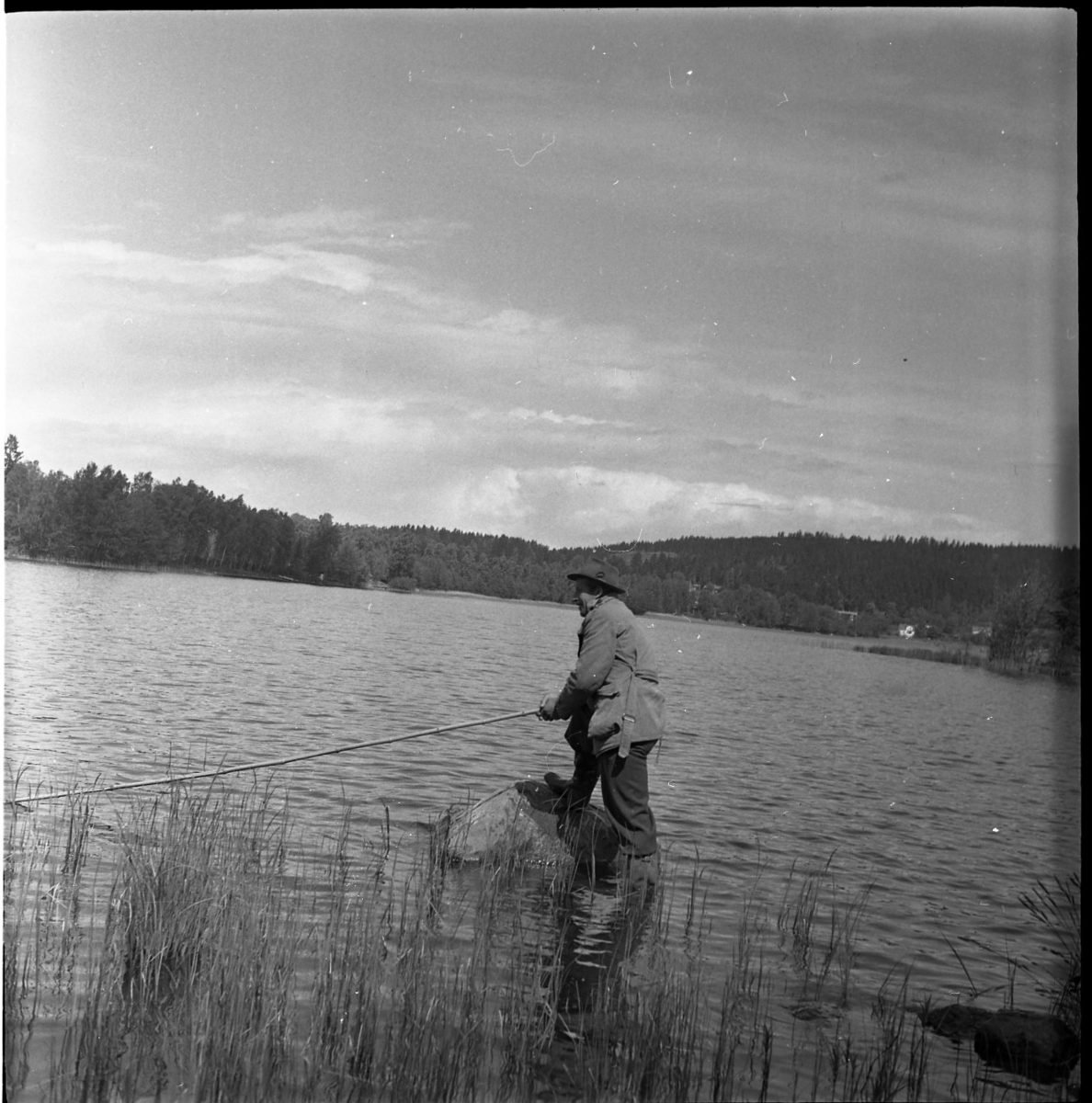 Titel: En man står med en foten på en sten i en sjö med ett metspö.
