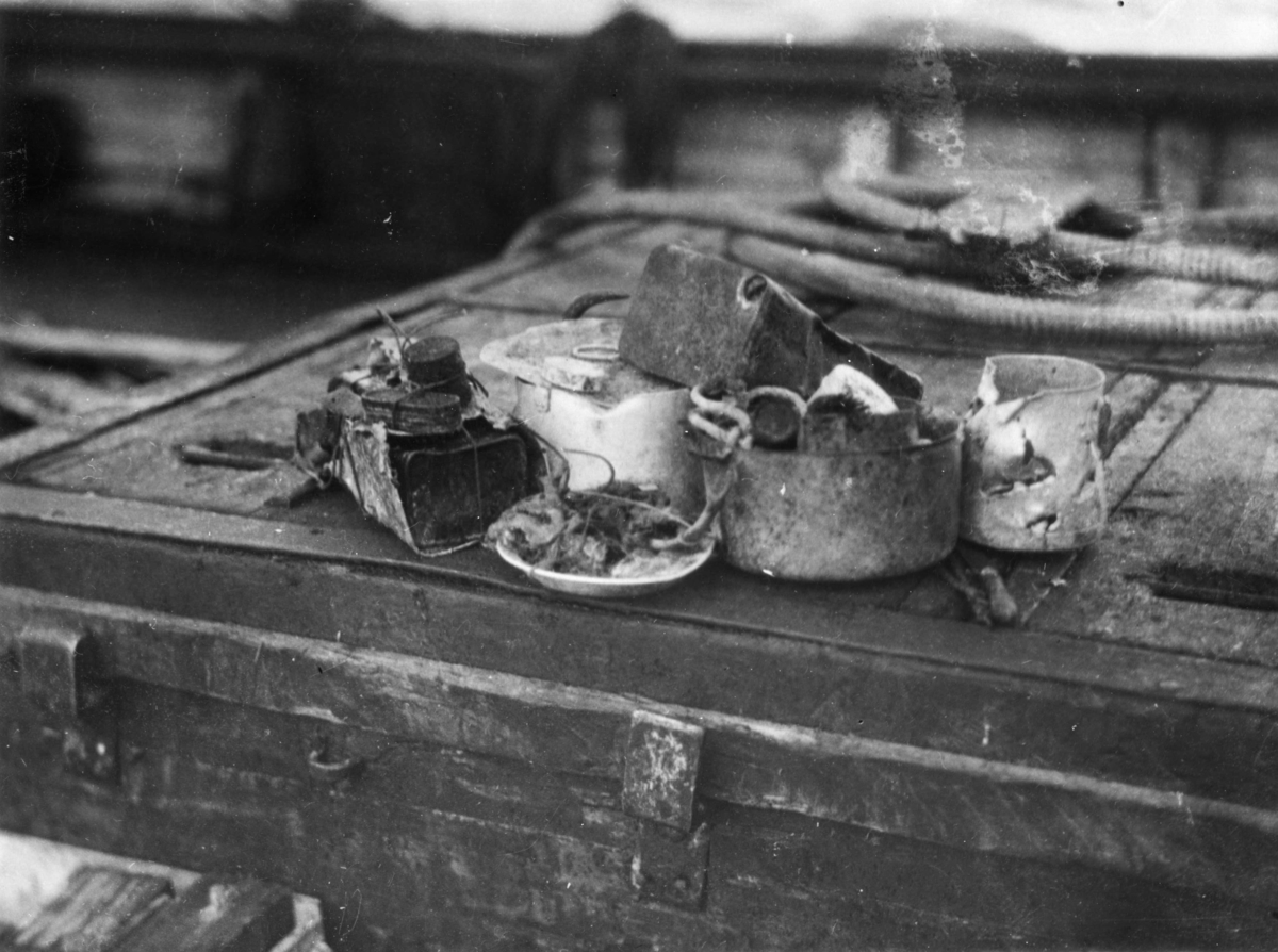 Fynd på Vitön: kastrull, tallrik, proviantburk med mera.