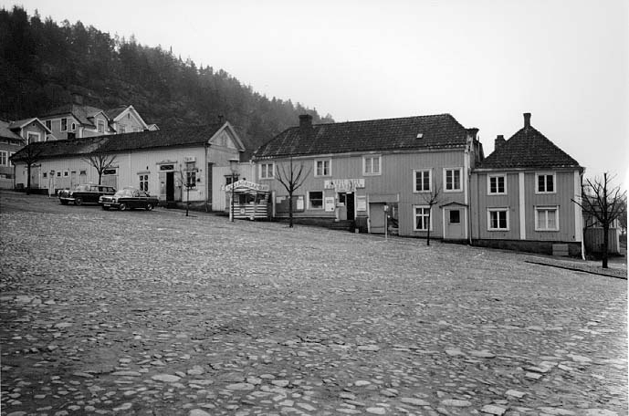 Kvartert Hjorten 9 i Gränna från torget. Foto från norr. I byggnaderna skyltas för "Taxi" samt "Minnes-saker Polkagrisar" Värdshus och Café. Framför byggnaden står en liten polkagrisrandig kur med texten "Polkagrisar". Två taxi-bilar av märket Mercedes Benz står parkerade till vänster.