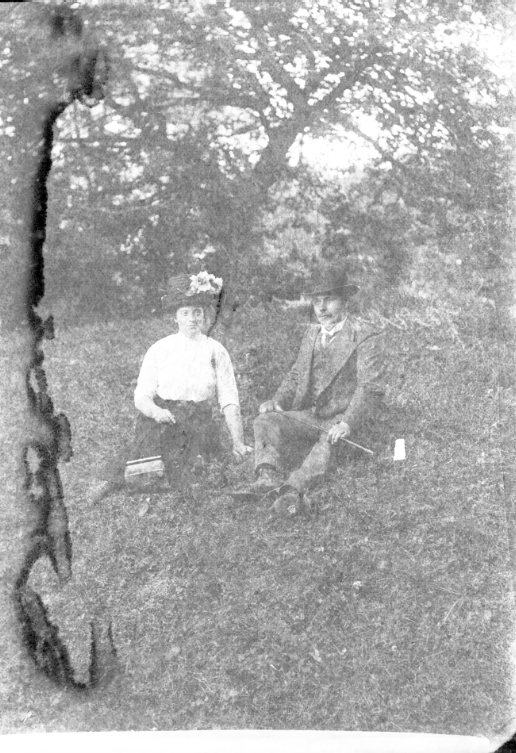En man och en kvinna sitter i en grässlänt. Mannen håller i en spatserkäpp och kvinnan i en handväska.