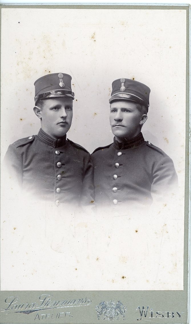 Kabinettsfotografi av två okända unga män i militär uniform.