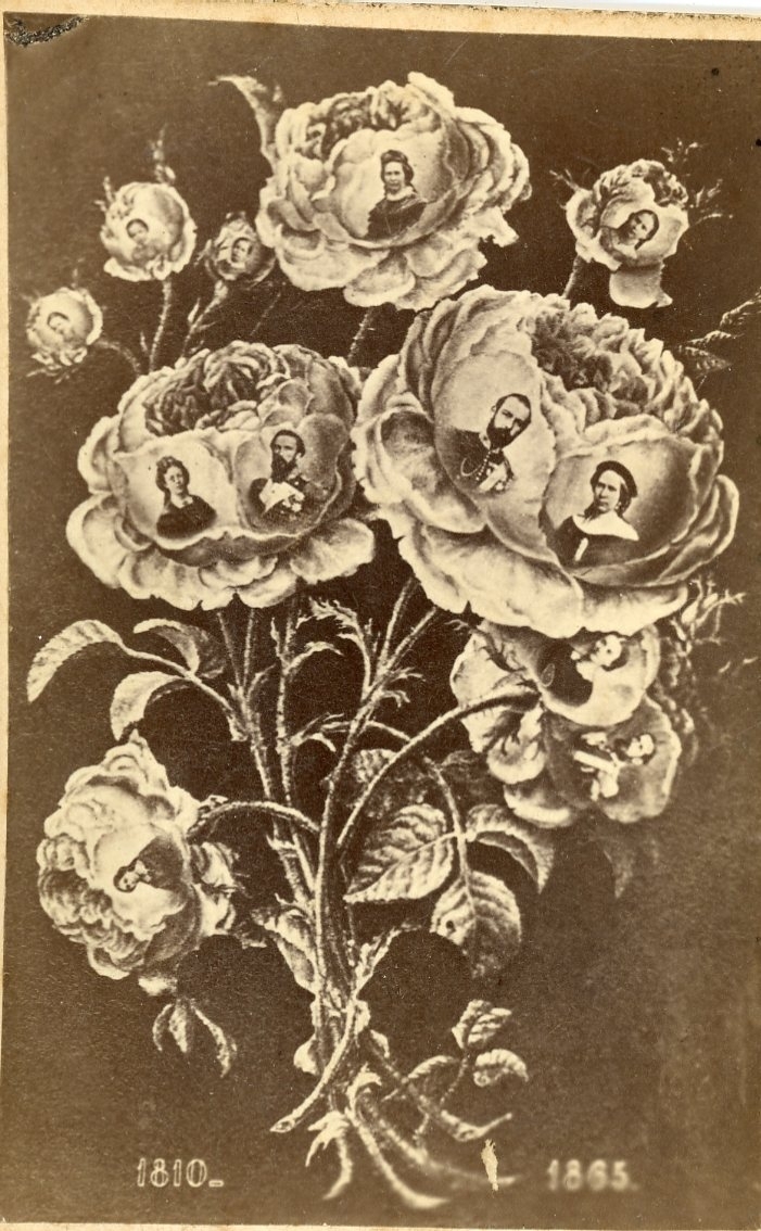 Kabinettsfotografi av ett blomstermotiv med porträtt av kungligheter och årtalen 1810 1865.