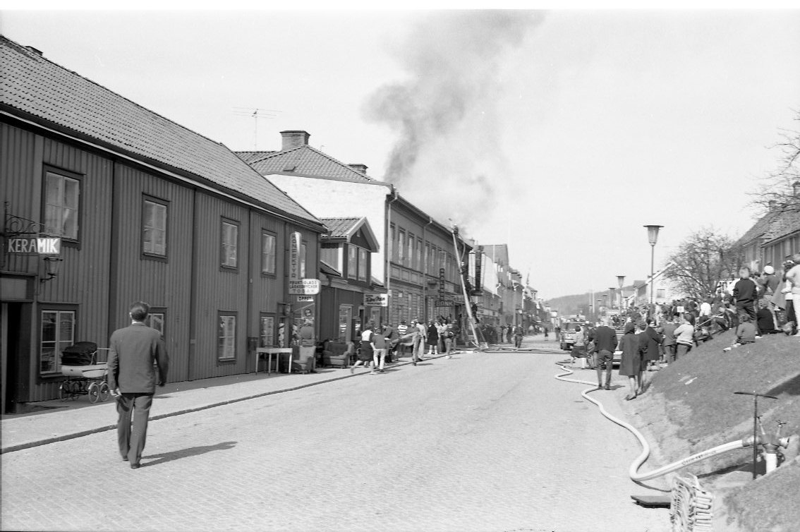 Det brinner i en fastighet utmed Brahegatan i Gränna. De ryker från taket. Brandmän står på gatan och bekämpar elden. En folksamling på trottoaren mittemot.