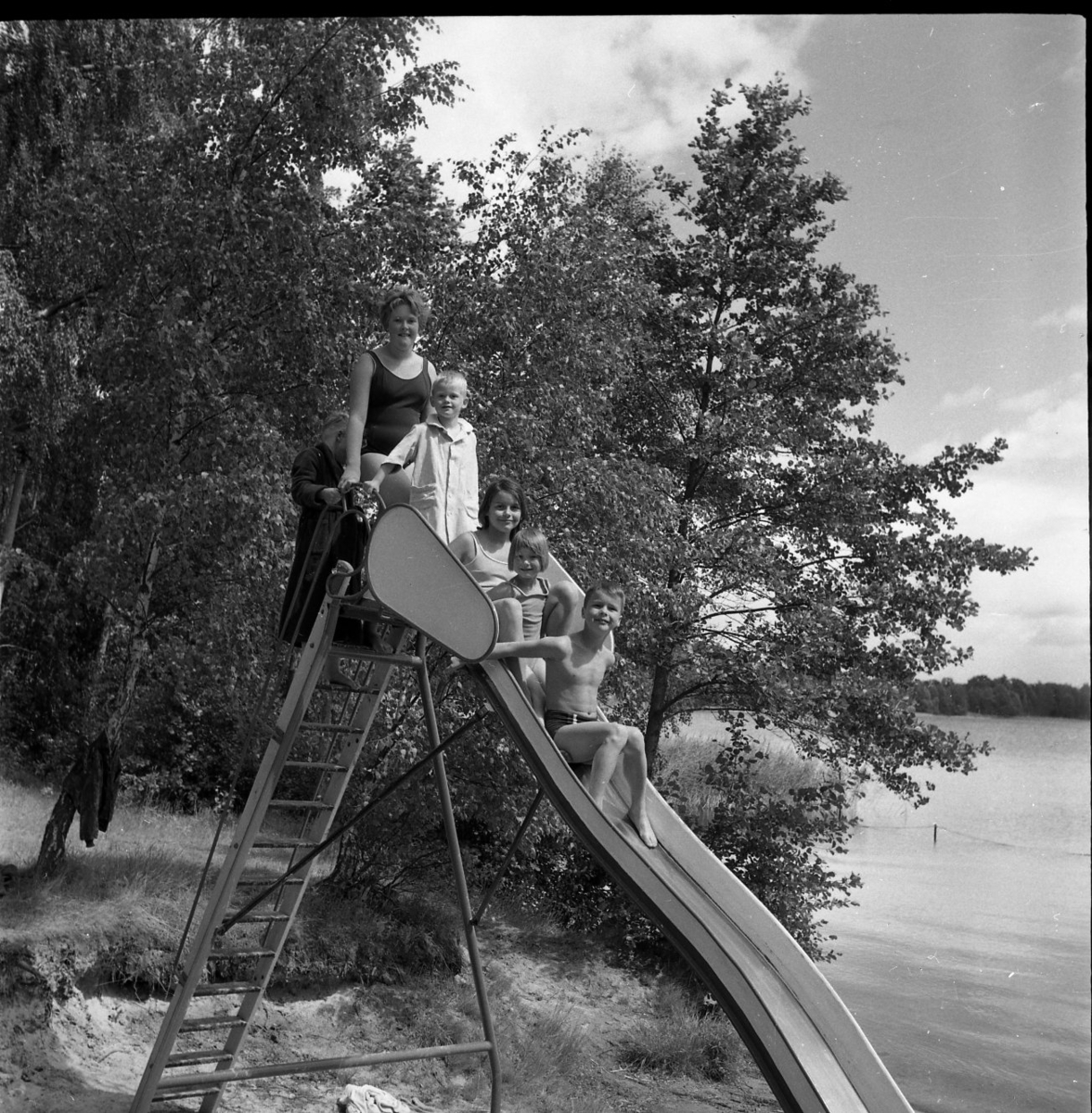 Sex barn i olika åldrar sitter i en rutschkana vid en badstrand.